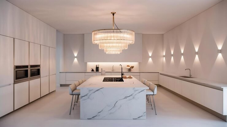 Light fixtures are functional and decorative. Chandeliers, pendant lamps, and sconces with metallic finishes catch the eye and create a luxurious atmosphere.