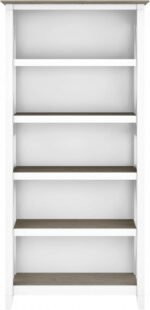 • Tall bookcase made of laminate over engineered wood in shiplap gray and pure white finish. Features three adjustable shelves for flexibility and two fixed shelves for stability. Assembled dimensions: 65.98″H x 31.73″W x 12.64″D.
