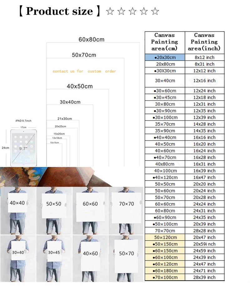 Size: 5*7inches (13*18 cm); 6*8 inches (15*20 cm) ; 8*10 inches (20*25 cm); 8*12 nches (21*30 cm); 12*16 inches (30*40 cm) ;13*20 inches (35*50 cm); 16*24 inches (40*60 cm); 20*28 inches (50*70 cm) ; 24*32 inches (60*80 cm)