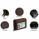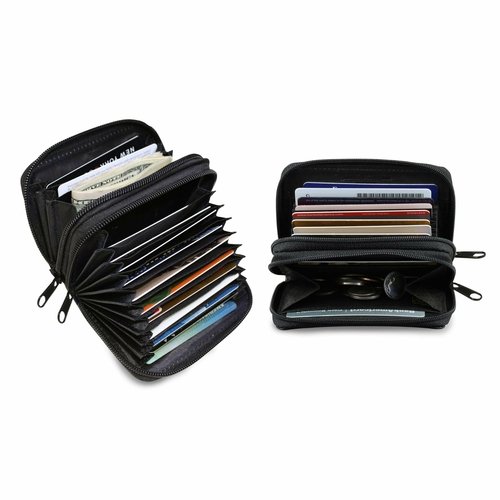 Perfect Size to Organize Almost Everything: 4.25 x 3.25 x 1.5 inches. The small card wallet fits in your hand, pocket or purse. There are two zipper compartments , One 10-card slots for cards, Seondly, 2 wide slots for bills, coins , tickets, receipt etc . In addition ID Display for each use