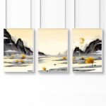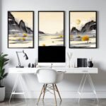Elevate your office space to a realm of tranquillity with our curated set of three wall art prints, showcasing a serene Japanese landscape adorned in gentle hues of light yellow, balanced with subtle greys and blacks. This collection has been meticulously selected to infuse your workspace with a Zen-like ambience, fostering a sense of calm and focus that enhances your productivity and well-being.